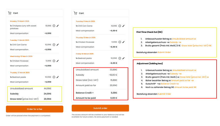 Checkout logic: one of the toughest challenges → designed a single consistent layout that covers free orders, partial payments, wallet credits and adjustments.