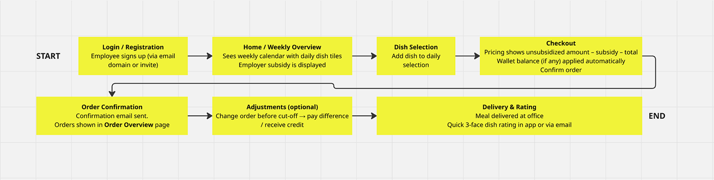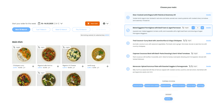 Build a platform where employees can pre-order lunches in seconds, companies can set daily subsidies and caterers receive well-structured orders with minimal back-and-forth.