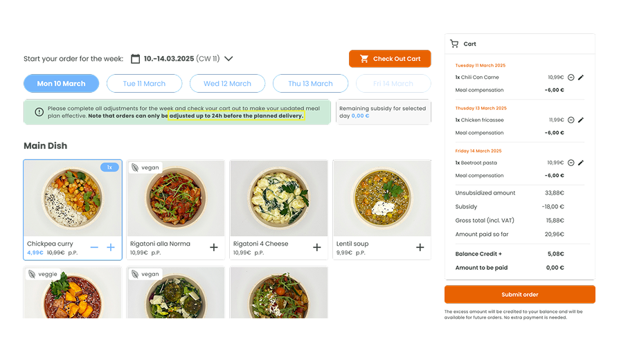 pre-order their favorite meals from curated local caterers, while employers set daily subsidies and get one simple invoice. Caterers receive well-structured orders, labels and delivery summaries, making operations smoother. The result: happier employees, less admin work for HR and consistent quality food every day.