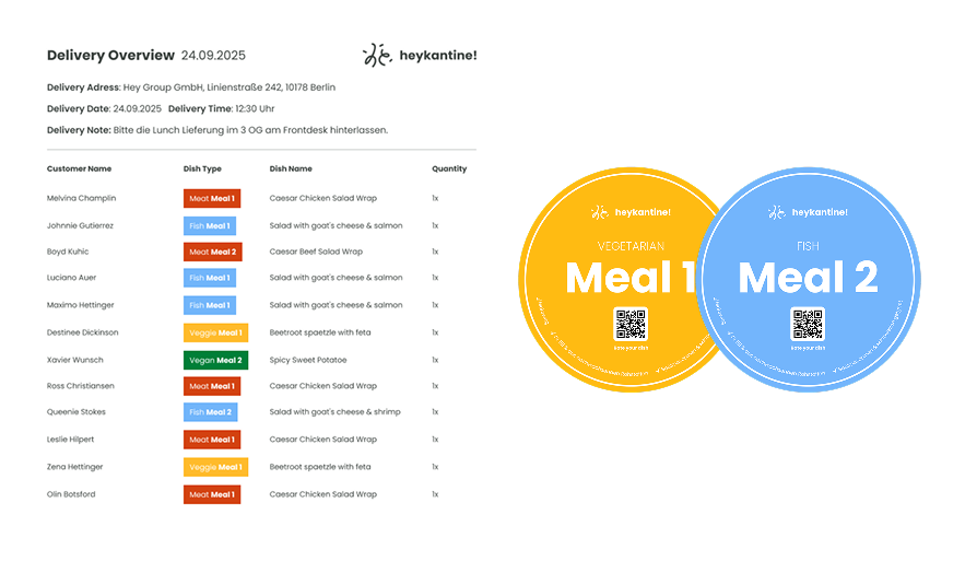 Caterers requested printable labels → we added labels with QR codes for ratings, plus delivery overview PDFs showing each dish per employee to ensure accurate fulfillment.